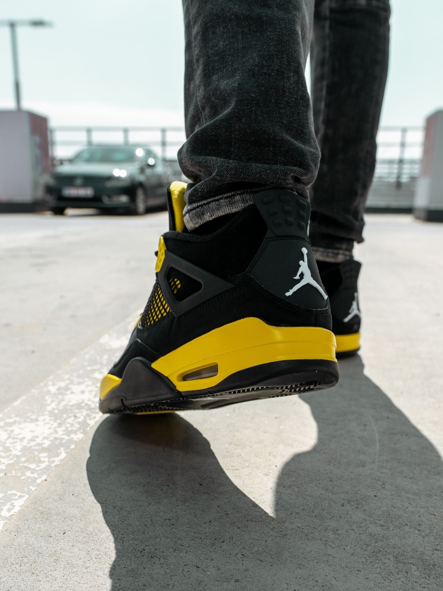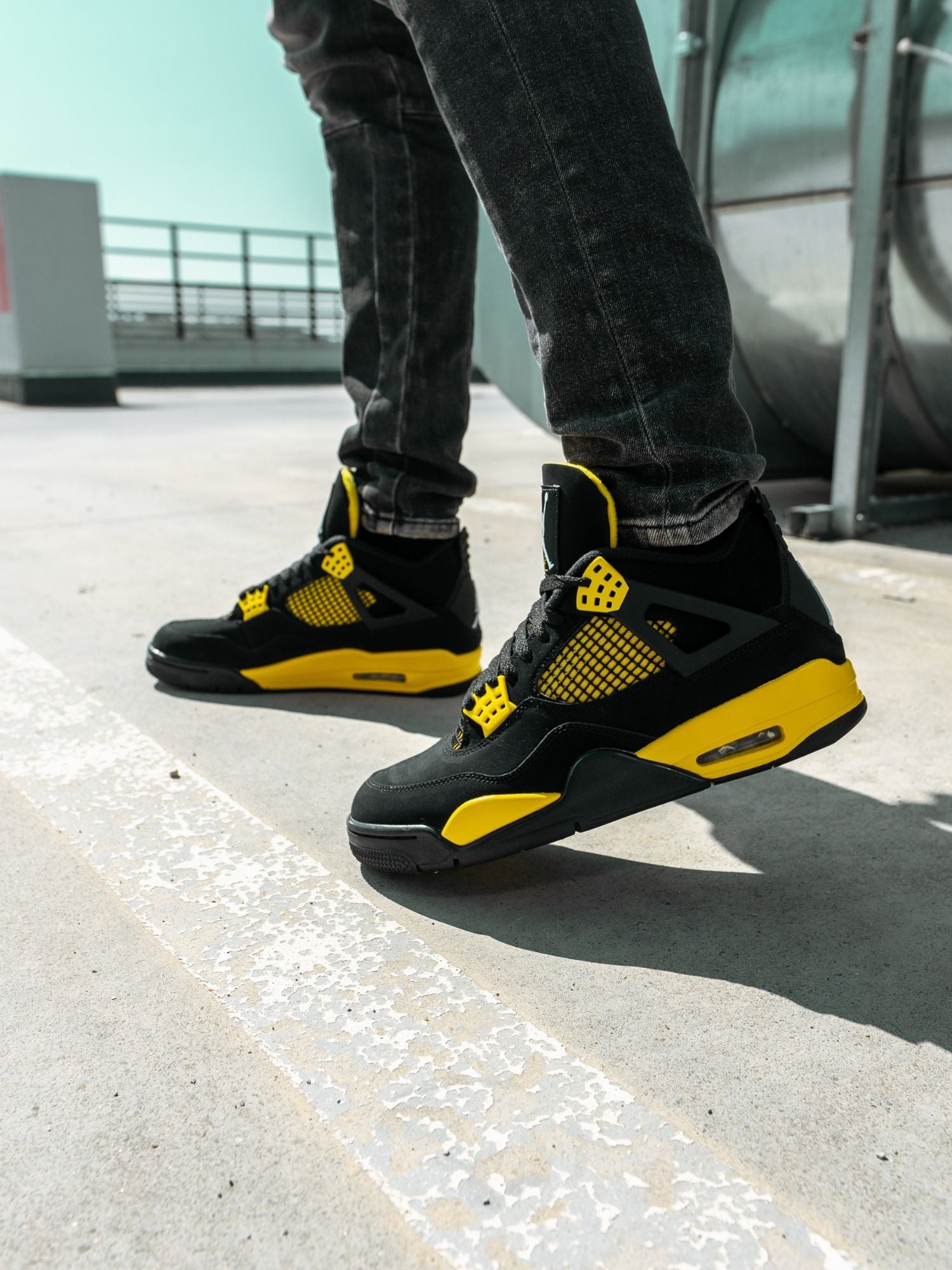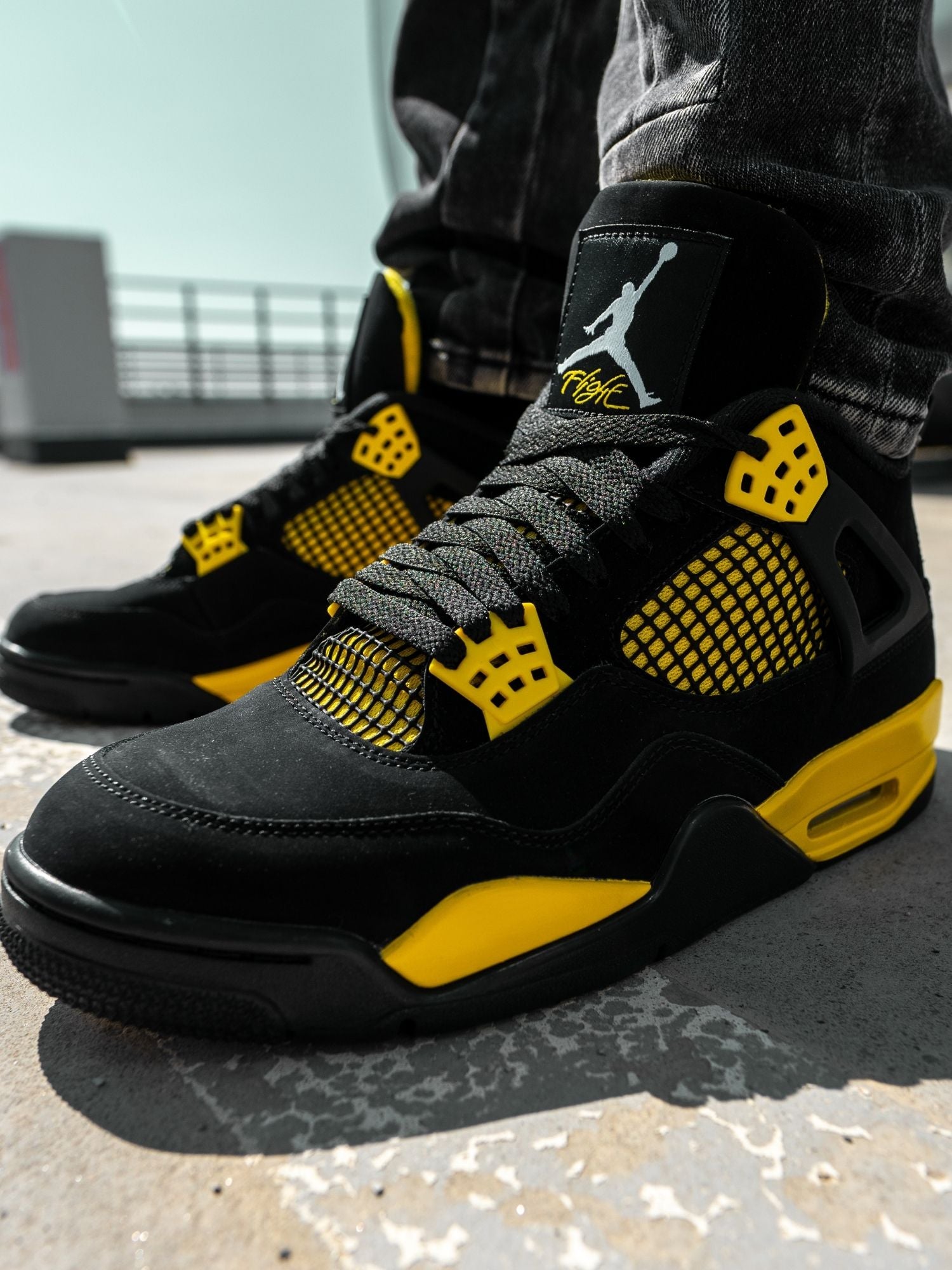 Air Jordan 4 este cel de-al patrulea model emblematic conceput pentru legenda baschetului american, Michael Jordan. Modelul 2023 "Thunder" reinvie populara schema de culori lansata pentru prima data in 2006, continuand sa impresioneze cu partea superioara din nubuc negru si accentele galbene.